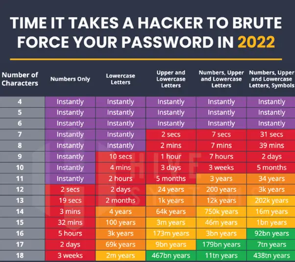 The graphic above shows how long it would take a computer to hack a password based on entirely random letter and number combinations. It’s worth noting that dictionary words (and other historically breached passwords) are usually tried first and are therefore far faster to crack.